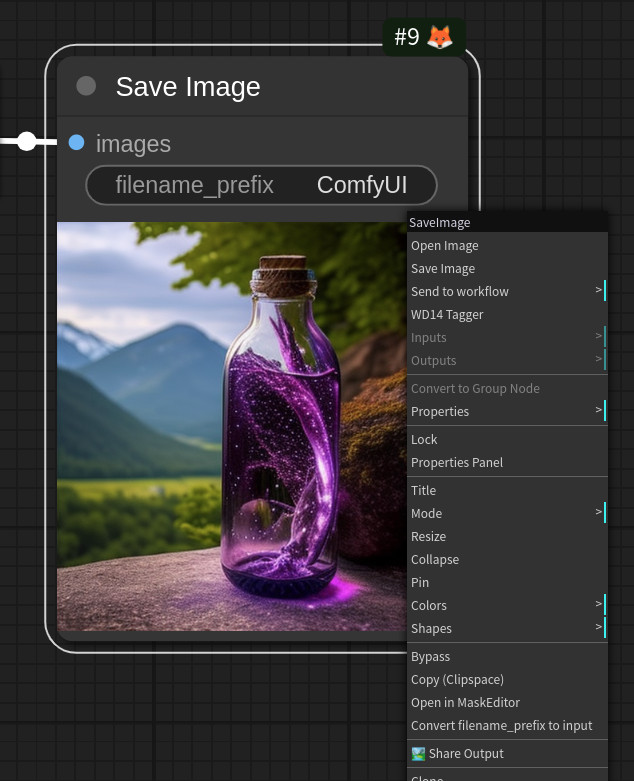 - You can share the workflow by clicking the Share button at the bottom of the main menu or selecting Share Output from the Context Menu of the Image node.